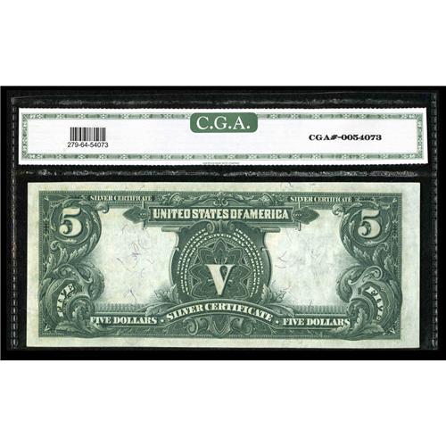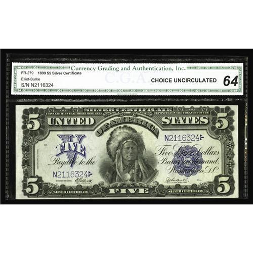 <B>Fr. 279 $5 1899 Silver Certificate CGA Choice Uncirculated 64.</B></I> A very attractive Chief, with broad margins and strong colors.