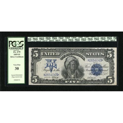 <B>Fr. 279 $5 1899 Silver Certificate PCGS Very Fine 30.</B></I> A solid Chief vignette is noted on this mid-grade issue.<BR><BR><b>Shipping:</b> Coins & Currency (<a target="_blank" href="http://www.heritageauctions.com/common/shipping.php">view shipping information</a>)