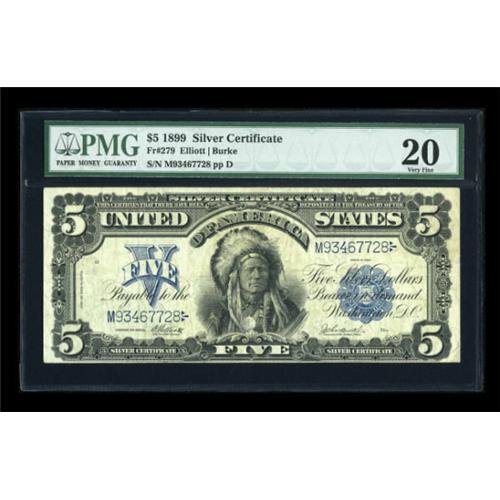 <B>Fr. 279 $5 1899 Silver Certificate PMG Very Fine 20.</B></I> This is a an evenly circulated note with plenty of crispness visible.<BR><BR><b>Shipping:</b> Coins & Currency (<a target="_blank" href="http://www.heritageauctions.com/common/shipping.php">view shipping information</a>)