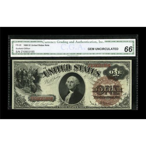 <B>Fr. 28 $1 1880 Legal Tender CGA Gem Uncirculated 66.</B></I> This note's first and last appearance in public was in 1995 as part of a fixed price list. The chocolate brown seal is appealing and adds to the overall eye appeal of this Gem.<BR><BR><b>Shipping:</b> Coins & Currency (<a target="_blank" href="http://www.heritageauctions.com/common/shipping.php">view shipping information</a>)