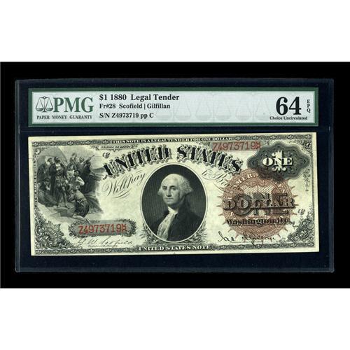 <B>Fr. 28 $1 1880 Legal Tender PMG Choice Uncirculated 64EPQ.</B></I> Just a touch under full Gem quality.<BR><BR><b>Shipping:</b> Coins & Currency (<a target="_blank" href="http://www.heritageauctions.com/common/shipping.php">view shipping information</a>)