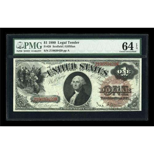 <B>Fr. 28 $1 1880 Legal Tender PMG Choice Uncirculated 64 EPQ.</B></I> A little tightness at lower right is noticed on this bright, well embossed Ace.<BR><BR><b>Shipping:</b> Coins & Currency (<a target="_blank" href="http://www.heritageauctions.com/common/shipping.php">view shipping information</a>)