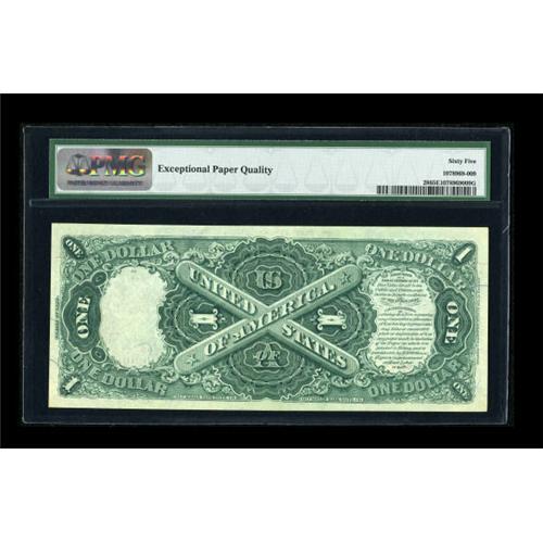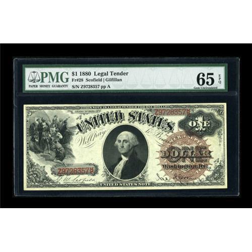 <B>Fr. 28 $1 1880 Legal Tender PMG Gem Uncirculated 65 EPQ.</B></I> Fr. 28 is the scarcest (by a small margin) number of this three-number Large Brown seal type. Fr. 30 is the most common of the group with a census of over 400 pieces. Fr. 28s have a small edge over 29s as the scarcest of the three signature combinations. This is a particularly nice example, with excellent paper surfaces, good color, and margins that support the 65 EPQ grade. <BR><I>From The John Ameen Collection</B></I><BR><BR><b>Shipping:</b> Coins & Currency (<a target="_blank" href="http://www.heritageauctions.com/common/shipping.php">view shipping information</a>)