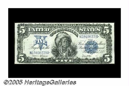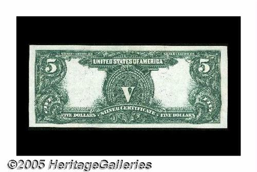 <B>Fr. 280 $5 1899 Mule Silver Certificate Choice About Uncirculated.</B></I> A barely discernible center fold is found on this quality Chief. Most all Fr. 280's are Mules.