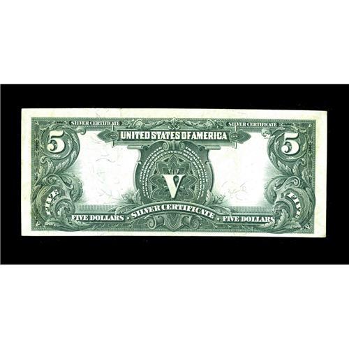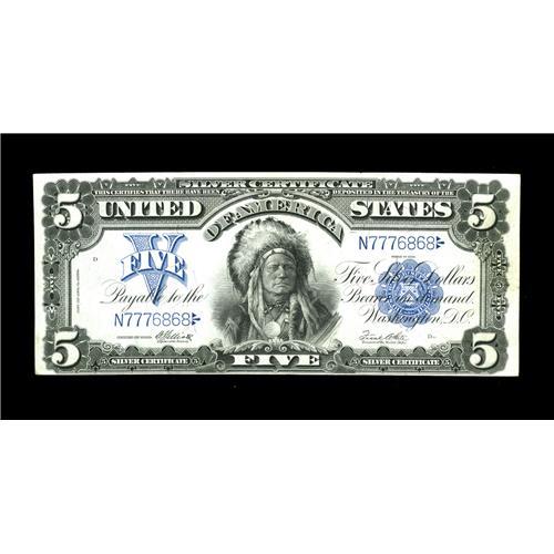 <B>Fr. 280 $5 1899 Mule Silver Certificate Extremely Fine-About New.</B></I> We are pleased to offer yet another upper mid-grade example tonight. This Chief has two vertical folds and a horizontal soft fold. The colors are quite pleasing and the paper crisp.