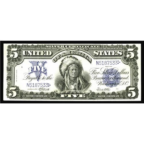 <B>Fr. 280 $5 1899 Mule Silver Certificate Extremely Fine.</B></I> This desirable Oncpapa has several soft vertical folds present on flat surfaces.