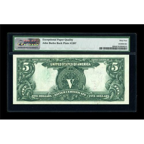 <B>Fr. 280 $5 1899 Mule Silver Certificate PMG Choice Uncirculated 64 EPQ.</B></I> John Burke Back Plate #1207 was used on this wonderfully original Chief. Excellent color is noticed and it is well margined.<BR><BR><b>Shipping:</b> Coins & Currency (<a target="_blank" href="http://www.heritageauctions.com/common/shipping.php">view shipping information</a>)