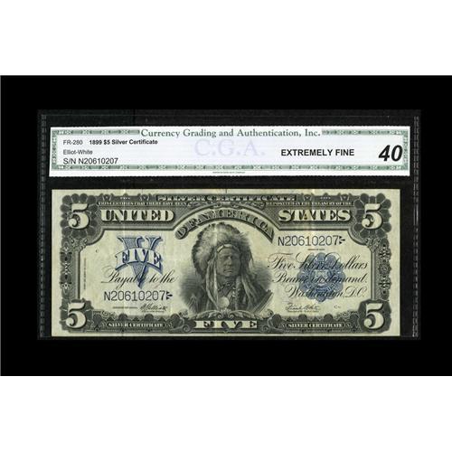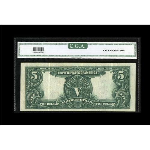 <B>Fr. 280 $5 1899 Mule Silver Certificate CGA Extremely Fine 40.</B></I> Fold counters would call this a Very Fine though the originality of the paper is every bit an XF. This design rounds out the top 10 in the book <I>100 Greatest American Currency Notes.</B></I><BR><I>From The Troy Wiseman Collection</B></I>