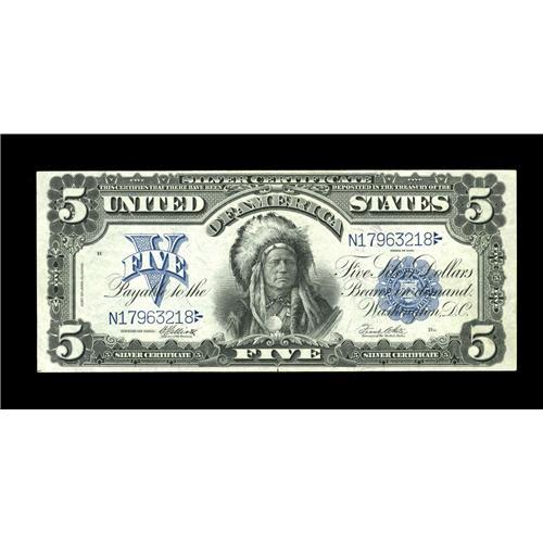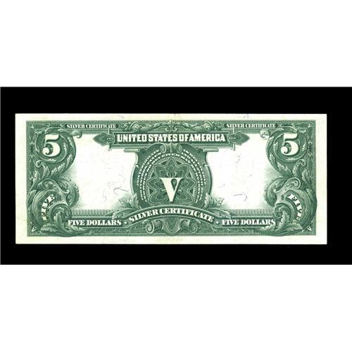 <B>Fr. 280 $5 1899 Silver Certificate Extremely Fine-About Uncirculated.</B></I> The color and paper quality are suggestive of nothing less than a AU grade, though there are a couple too many bends in the note to justify that grade. While technically an XF-AU note, it will see nothing less than AU money tonight.