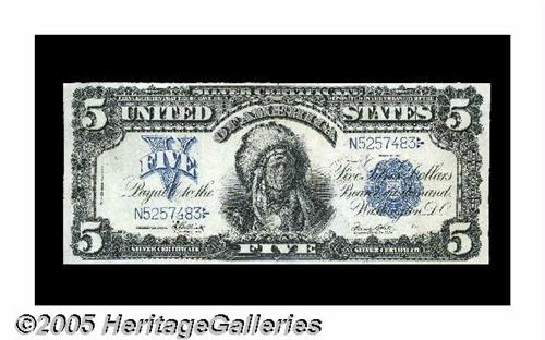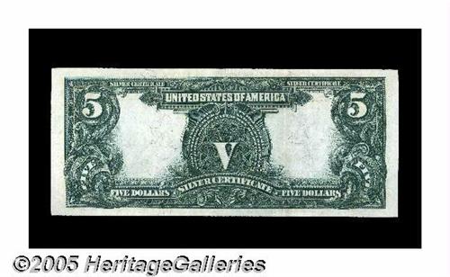 <B>Fr. 280 $5 1899 Silver Certificate Extremely Fine.</B></I> A premium note with broad margins and bright color. The few scattered folds are extremely faint and result in a note that rivals many fully uncirculated examples of the type in terms of overall eye appeal and general attractiveness. Please bid accordingly