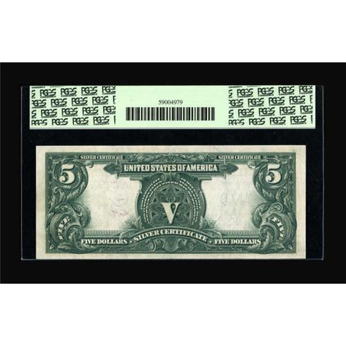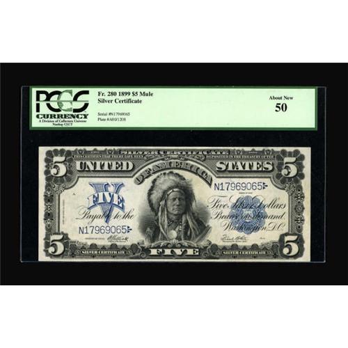 <B>Fr. 280 $5 1899 Mule Silver Certificate PCGS About New 50.</B></I> This briefly circulated specimen has all the appearance of a fully uncirculated issue. The margins are pleasing and the paper is bright.<B><BR></B></I><I>From The John Ameen Collection</B></I><BR><BR><b>Shipping:</b> Coins & Currency (<a target="_blank" href="http://www.heritageauctions.com/common/shipping.php">view shipping information</a>)