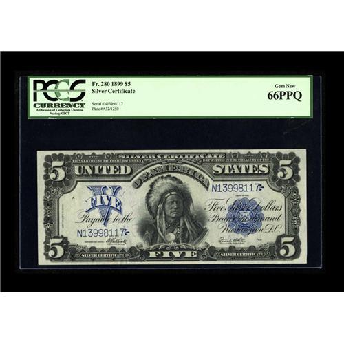 <B>Fr. 280 $5 1899 Mule Silver Certificate PCGS Gem New 66PPQ.</B></I> All the right paper waves are in all the right places. The serial numbers show bold embossing that is visible from the back.<BR><BR><b>Shipping:</b> Coin/Currency (<a target="_blank" href="http://www.heritageauctions.com/common/shipping.php">view shipping information</a>)