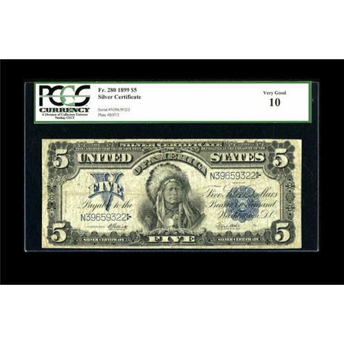 <B>Fr. 280 $5 1899 Silver Certificate PCGS Very Good 10.</B></I> This Friedberg number is not as populous in the census as Fr. 281.<BR><BR><b>Shipping:</b> Coins & Currency (<a target="_blank" href="http://www.heritageauctions.com/common/shipping.php">view shipping information</a>)