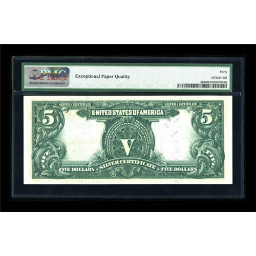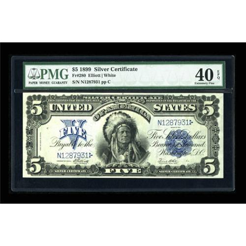 <B>Fr. 280 $5 1899 Mule Silver Certificate PMG Extremely Fine 40 EPQ.</B></I> A wonderful Chief in a very desirable mid-grade with utterly natural surfaces. Strong embossing complements excellent paper ripple.<BR><BR><b>Shipping:</b> Coins & Currency (<a target="_blank" href="http://www.heritageauctions.com/common/shipping.php">view shipping information</a>)