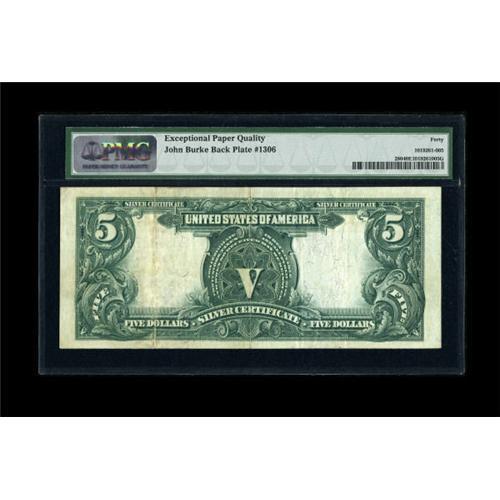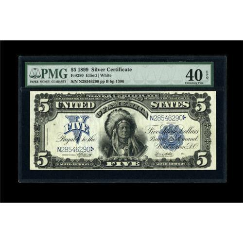 <B>Fr. 280 $5 1899 Mule Silver Certificate PMG Extremely Fine 40 EPQ.</B></I> Embossed details of the overprint show through on the back of this lightly circulated issue.<BR><BR><b>Shipping:</b> Coins & Currency (<a target="_blank" href="http://www.heritageauctions.com/common/shipping.php">view shipping information</a>)