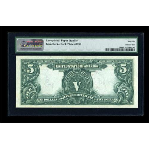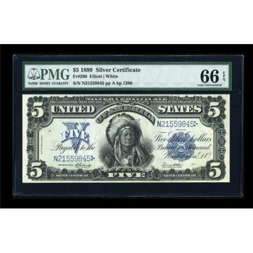 <B>Fr. 280 $5 1899 Mule Silver Certificate PMG Gem Uncirculated 66 EPQ.</B></I> Fr. 280 is the second to last of the Chief numbers. This particular example is a mule indicated by back plate # 1296 which was one of the plate numbers prepared for notes intended for Burke's signature. It is relatively common in most grades (PMG has graded 148 pieces), but is decidedly rare at the upper-end of the grading system. This note is one of only five PMG 66s for this number with no pieces having been graded higher. The note is lovely with excellent margins, strong color, and original embossing that can be easily seen through the holder. The successful bidder on this note, now owning a mule, should contact the cataloger about the 40 acres he has coming to him.<BR><BR><b>Shipping:</b> Coins & Currency (<a target="_blank" href="http://www.heritageauctions.com/common/shipping.php">view shipping information</a>)