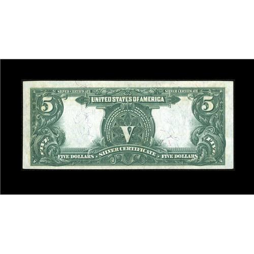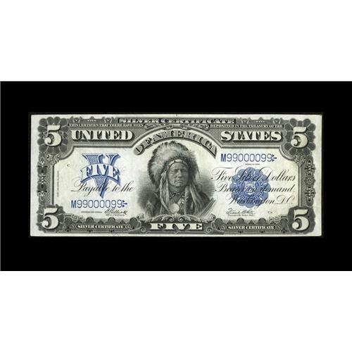 <B>Fr. 280 $5 1899 Mule Silver Certificate Very Choice New.</B></I> This perfectly original near-gem Chief has both its visual appeal and appearance enhanced by the neat eight digit radar serial number M99000099. The note has pronounced original embossing, broad margins and great eye appeal. Slightly low back centering is all that holds it from the full Gem grade.