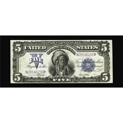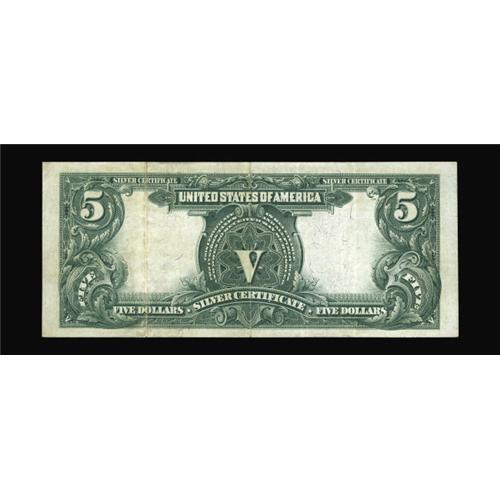 <B>Fr. 280 $5 1899 Mule Silver Certificate Very Fine-Extremely Fine.</B></I> This example is truly a tale of two sides. The face clearly looks better than XF, while the back shows two hard folds.