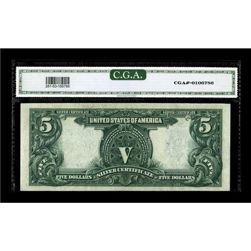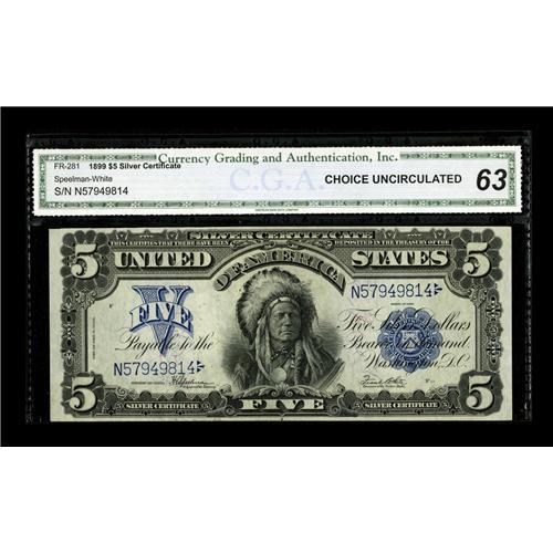 <B>Fr. 281 $5 1899 Silver Certificate CGA Choice Uncirculated 63.</B></I> This pleasing piece may have been Gem though a few freckled spots are noted at the left of the Chief's portrait.<BR><BR><b>Shipping:</b> Coin/Currency (<a target="_blank" href="http://www.heritageauctions.com/common/shipping.php">view shipping information</a>)