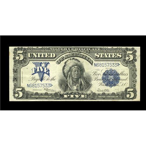 <B>Fr. 281 $5 1899 Silver Certificate Extremely Fine.</B></I> Two light vertical folds and a light horizontal fold on this attractive, perfectly natural Chief.
