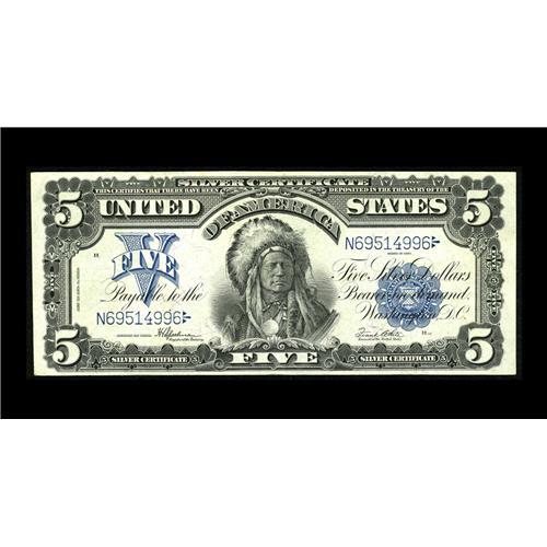 <B>Fr. 281 $5 1899 Silver Certificate Extremely Fine.</B></I> This previously unreported note carries the new high serial number for the entire Chief design. Also, it has encountered overall light circulation.<BR><BR><b>Shipping:</b> Coin/Currency (<a target="_blank" href="http://www.heritageauctions.com/common/shipping.php">view shipping information</a>)