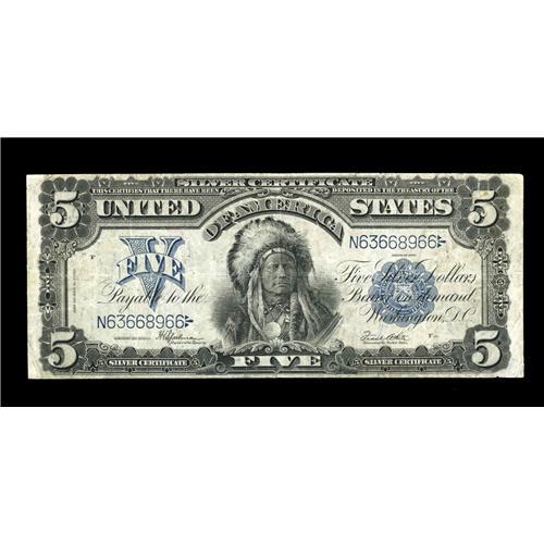 <B>Fr. 281 $5 1899 Silver Certificate Fine.</B></I> Though wet at one time, the Onepapa Vignette at center is solid and unhindered by folds.