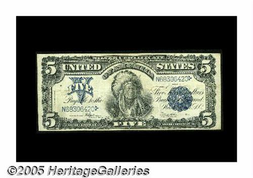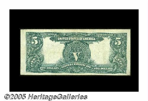<B>Fr. 281 $5 1899 Silver Certificate Fine-Very Fine.</B></I> This crispy Chief may have been wet at one time.