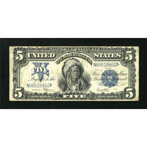 <B>Fr. 281 $5 1899 Silver Certificate Fine.</B></I> Average circulation and solid margins are exhibited by this bright Chief.<BR><BR><b>Shipping:</b> Coins & Currency (<a target="_blank" href="http://www.heritageauctions.com/common/shipping.php">view shipping information</a>)