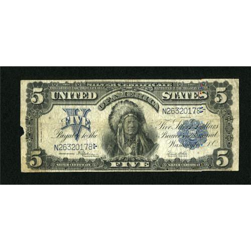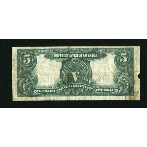 <B>Fr. 281 $5 1899 Silver Certificate Good-Very Good.</B></I> A portion of the margin is missing at left and there are a few other holes visible.<BR><BR><b>Shipping:</b> Coins & Currency (<a target="_blank" href="http://www.heritageauctions.com/common/shipping.php">view shipping information</a>)