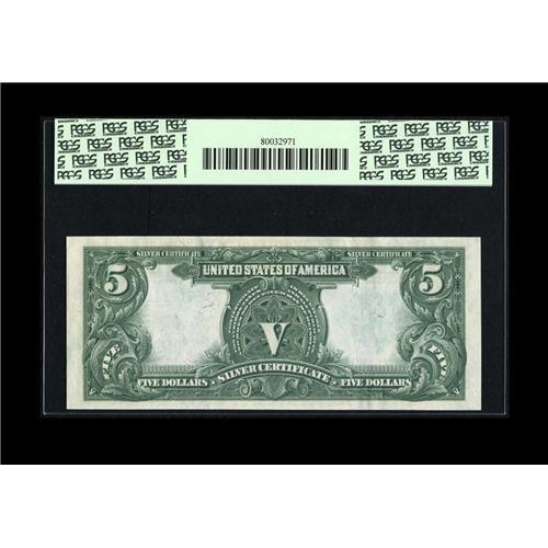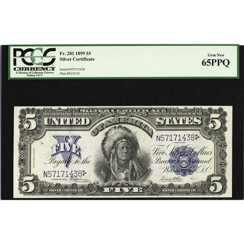 <B>Fr. 281 $5 1899 Silver Certificate PCGS Gem New 65PPQ.</B></I> A newly discovered note not mentioned in the census does justice to G.F.C. Smillie's engraved portrait of Sioux chief Running Antelope outfitted in a Pawnee plume headdress. One of the most popular notes with type collectors in a most desirable state of preservation. Beautiful color flows across the original surfaces.