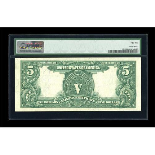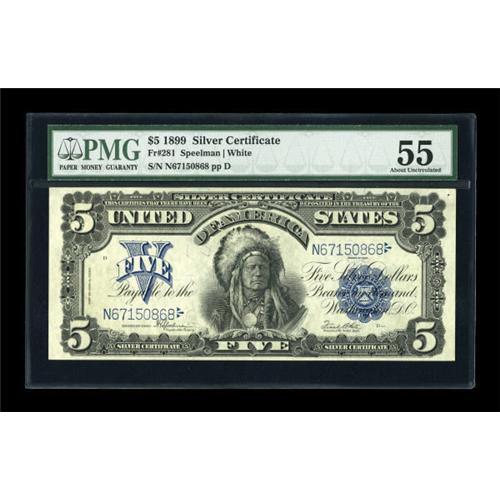 <B>Fr. 281 $5 1899 Silver Certificate PMG About Uncirculated 55.</B></I> A pinhole in the margin is noticed on this otherwise pleasing Chief that has blazing color.<BR><BR><b>Shipping:</b> Coins & Currency (<a target="_blank" href="http://www.heritageauctions.com/common/shipping.php">view shipping information</a>)