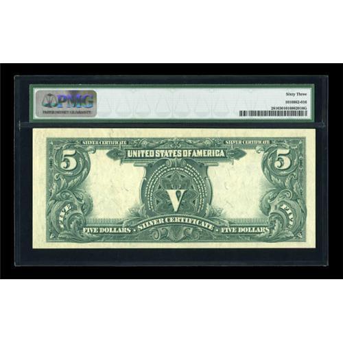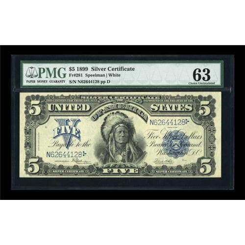 <B>Fr. 281 $5 1899 Silver Certificate PMG Choice Uncirculated 63.</B></I> A pleasing note that appears to have earned all of its 63 grade.<BR><BR><b>Shipping:</b> Coins & Currency (<a target="_blank" href="http://www.heritageauctions.com/common/shipping.php">view shipping information</a>)