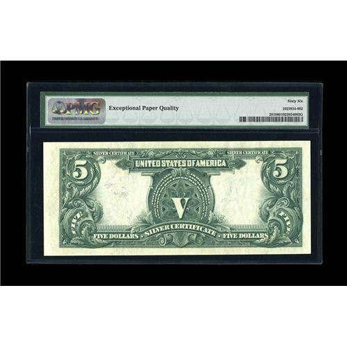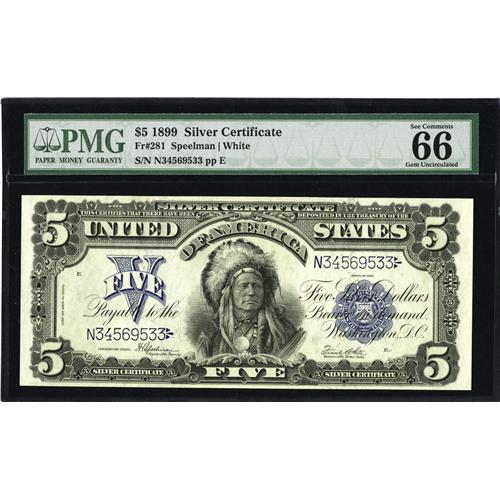 <B>Fr. 281 $5 1899 Silver Certificate PMG Gem Uncirculated 66 EPQ.</B></I> This Chief has knockout eye appeal, with huge margins, gorgeous colors and embossing that's visible through the holder. Fr. 281 is the final number of the Chiefs, and as the most common number in high grade, it's avidly pursued as a Type example. This piece has the look that condition-conscious collectors strive for. Expect to see some spirited bidding before the hammer falls.