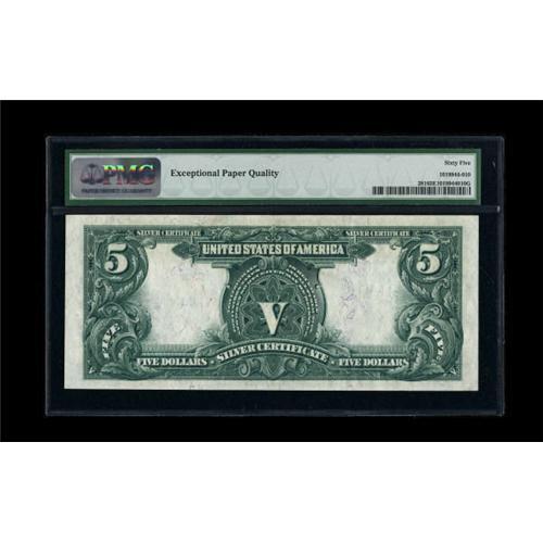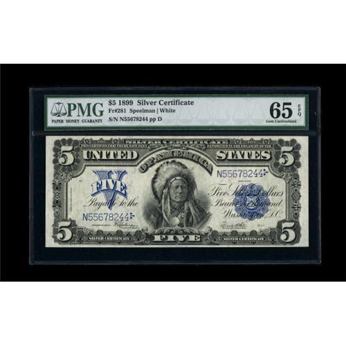 <B>Fr. 281 $5 1899 Silver Certificate PMG Gem Uncirculated 65 EPQ.</B></I> The inks are bright and the margins even on this glorious example that is nicely embossed.<BR><BR><b>Shipping:</b> Coins & Currency (<a target="_blank" href="http://www.heritageauctions.com/common/shipping.php">view shipping information</a>)