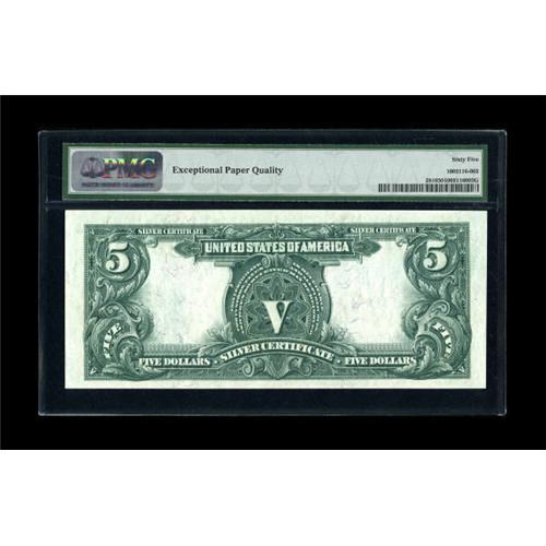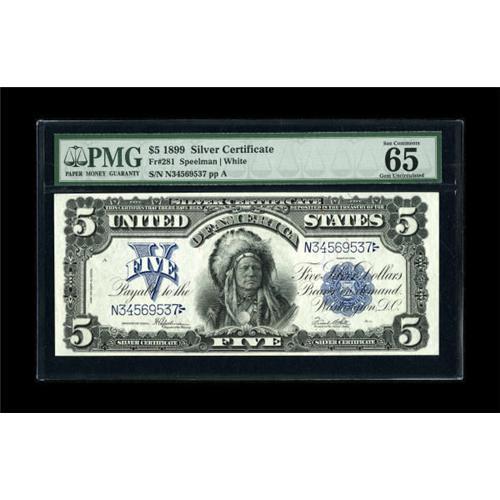 <B>Fr. 281 $5 1899 Silver Certificate PMG Gem Uncirculated 65 EPQ.</B></I> Natural, problem free surfaces are noticed on this wonderfully margined Chief. The inks are splendid and the print quality serves up loads of eye appeal.<BR><BR><b>Shipping:</b> Coins & Currency (<a target="_blank" href="http://www.heritageauctions.com/common/shipping.php">view shipping information</a>)