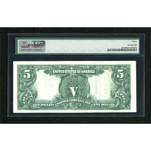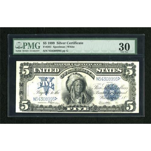 <B>Fr. 281 $5 1899 Silver Certificate PMG Very Fine 30.</B></I> The paper is bright and the details uninterrupted by the traces of light circulation.<BR><BR><b>Shipping:</b> Coins & Currency (<a target="_blank" href="http://www.heritageauctions.com/common/shipping.php">view shipping information</a>)