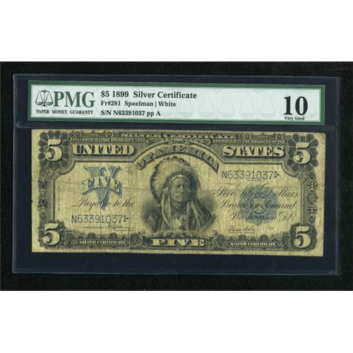 <B>Fr. 281 $5 1899 Silver Certificate PMG Very Good 10.</B></I> An evenly circulated example with a bold Chief vignette.<BR><BR><b>Shipping:</b> Coins & Currency (<a target="_blank" href="http://www.heritageauctions.com/common/shipping.php">view shipping information</a>)