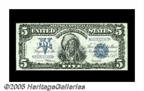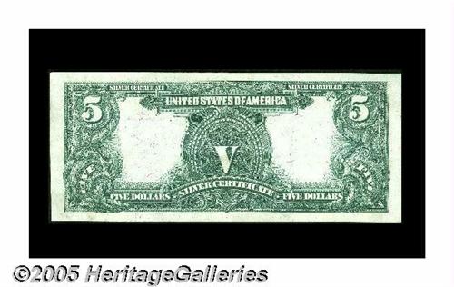 <B>Fr. 281 $5 1899 Silver Certificate Very Choice New.</B></I> With just a tiny sliver more top margin this gorgeous Chief would make the Gem grade. The note has tremendous eye appeal, bold colors, and perfect back centering.