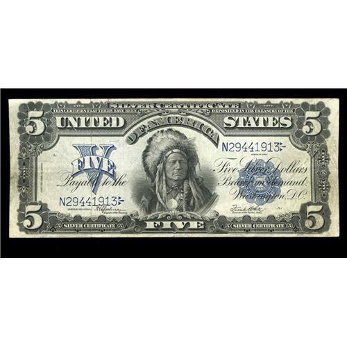 <B>Fr. 281 $5 1899 Silver Certificate Very Fine.</B></I> A nicely centered Indian Chief note with considerable crispness and bordering on the next higher grade.