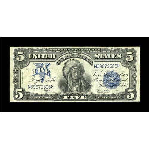 <B>Fr. 281 $5 1899 Silver Certificate Very Fine.</B></I> The paper is crisp and the colors are bright on this always-popular Indian Chief note in a very collectible grade. Solid, no problem margins add to the allure of this piece.<BR><BR><b>Shipping:</b> Coin/Currency (<a target="_blank" href="http://www.heritageauctions.com/common/shipping.php">view shipping information</a>)