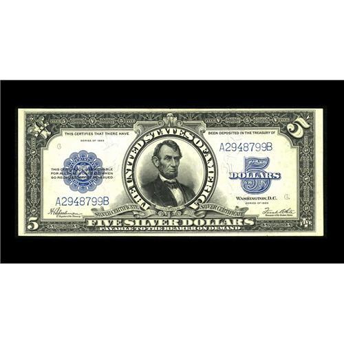 <B>Fr. 282 $5 1923 Silver Certificate About New.</B></I> Light handling is found on this eye appealing Porthole. Portholes of this caliber are becoming infrequent sights in this white-hot market for large size type.<BR><BR><b>Shipping:</b> Coin/Currency (<a target="_blank" href="http://www.heritageauctions.com/common/shipping.php">view shipping information</a>)