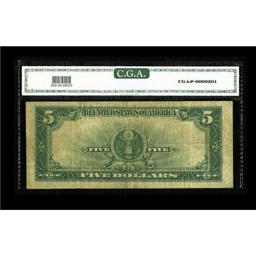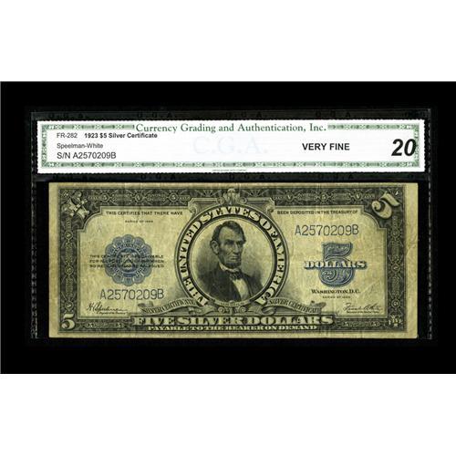 <B>Fr. 282 $5 1923 Silver Certificate CGA Very Fine 20.</B></I> A decent mid grade example of this popular design that comes in one signature combination only.<BR><BR><b>Shipping:</b> Coin/Currency (<a target="_blank" href="http://www.heritageauctions.com/common/shipping.php">view shipping information</a>)