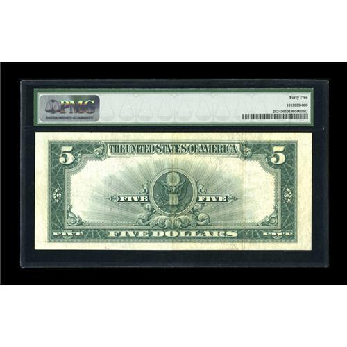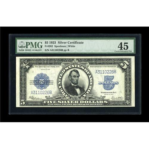 <B>Fr. 282 $5 1923 Silver Certificate PMG Choice Extremely Fine 45.</B></I> A totally natural Porthole, with a bright blue overprint and original paper surfaces.<BR><BR><b>Shipping:</b> Coins & Currency (<a target="_blank" href="http://www.heritageauctions.com/common/shipping.php">view shipping information</a>)