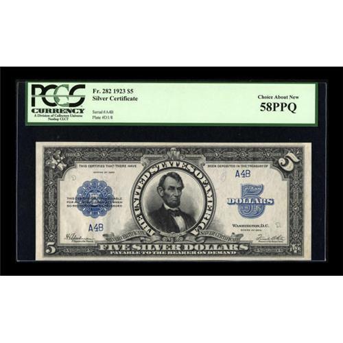 <B>Fr. 282 $5 1923 Silver Certificate PCGS Choice About New 58PPQ.</B></I> There are currently five single-digit Portholes known, with the A3B note recorded as the lowest serial number known to date. That note is ensconced in a strongly held collection, having been off the market for six years now, making this A4B note the lowest available to the collecting fraternity. If you are looking for a single-digit note, now could be your last chance for many years to acquire such a rarity as this. <BR><BR><b>Shipping:</b> Coins & Currency (<a target="_blank" href="http://www.heritageauctions.com/common/shipping.php">view shipping information</a>)