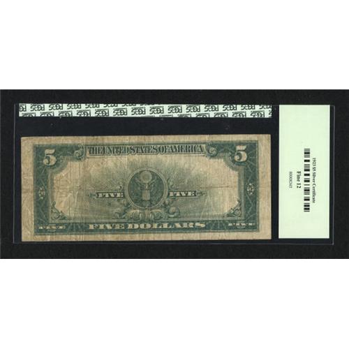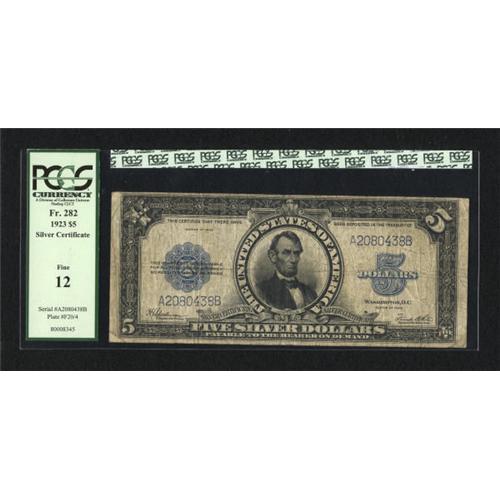 <B>Fr. 282 $5 1923 Silver Certificate PCGS Fine 12.</B></I> This evenly circulated Porthole $5 looks like its only crime was to show up everyday and work the channels of commerce until it was retired by a numismatist.<BR><BR><b>Shipping:</b> Coins & Currency (<a target="_blank" href="http://www.heritageauctions.com/common/shipping.php">view shipping information</a>)