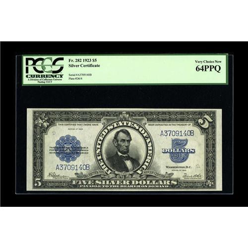 <B>Fr. 282 $5 1923 Silver Certificate PCGS Very Choice New 64PPQ.</B></I> The original embossing is easily seen on this handsome Lincoln Porthole Silver Certificate. That, combined with the margins and color, give this Very Choice example the appearance of a perfect Gem.<BR><BR><b>Shipping:</b> Coin/Currency (<a target="_blank" href="http://www.heritageauctions.com/common/shipping.php">view shipping information</a>)
