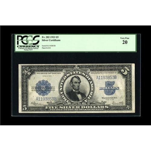 <B>Fr. 282 $5 1923 Silver Certificate PCGS Very Fine 20.</B></I> This decent mid-grade representative of the famed porthole design may very well launch another collector's interest.