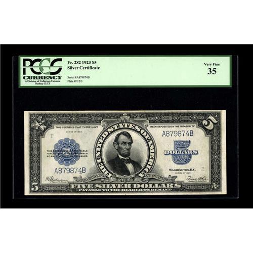 <B>Fr. 282 $5 1923 Silver Certificate PCGS Very Fine 35.</B></I> A grade such as this has virtually disappeared within this series. Bright colors and even margins accent this famed "Porthole" note.<BR><I>From The Collection of Daniel Weissman</B></I><BR><BR><b>Shipping:</b> Coin/Currency (<a target="_blank" href="http://www.heritageauctions.com/common/shipping.php">view shipping information</a>)