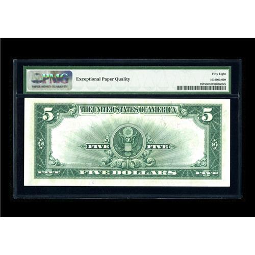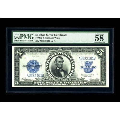 <B>Fr. 282 $5 1923 Silver Certificate PMG Choice About Unc 58 EPQ.</B></I> This note appears Gem at first glance, but close examination reveals a small corner fold that really is inconsequential. The paper is clearly original and most attractive.<BR><I>From The Bill and Kathy Stella Currency Collection</B></I><BR><BR><b>Shipping:</b> Coin/Currency (<a target="_blank" href="http://www.heritageauctions.com/common/shipping.php">view shipping information</a>)