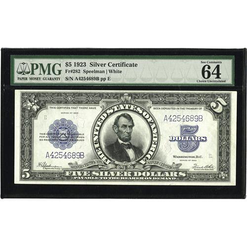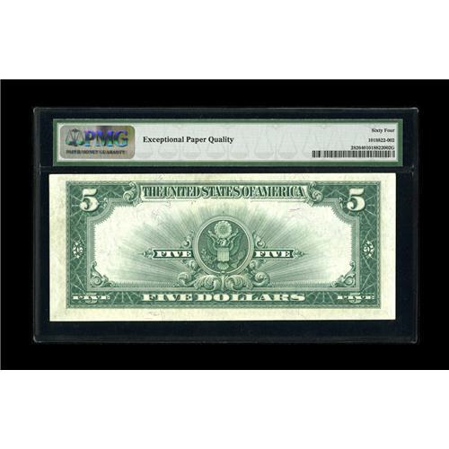 <B>Fr. 282 $5 1923 Silver Certificate PMG Choice Uncirculated 64 EPQ.</B></I> The top margin, while sufficient for Gem is not quite evenly matched with the other three boardwalk margins, thus accounting for the grade. The paper quality is clearly original and is matched by excellent embossing. This "Porthole" design is listed at No. 30 in the book <I>100 Greatest American Currency Notes.</B></I><BR><I>From The Troy Wiseman Collection</B></I>